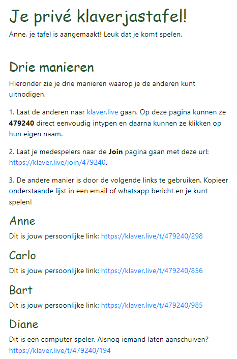 De meest gebruikte manier is om deze vier links te kopiëren en in een email of whatsapp naar de andere spelers te sturen. De andere manier is dat je de tafelcode doorstuurt, want daarmee kunnen ze op de homepage ook naar deze tafel komen.