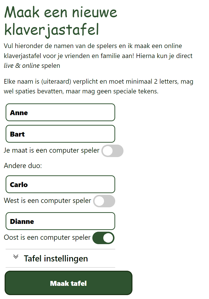 De eerste stap om online te kunnen spelen, zijn de namen van de verschillende spelers. Klaverjassen speel je (uiteraard) met twee teams van twee spelers, de teams zitten straks - op de online tafel - ook tegenover elkaar. De naam van de speler die je als eerste opgeeft, heeft straks meer rechten (zie Administrator menu)